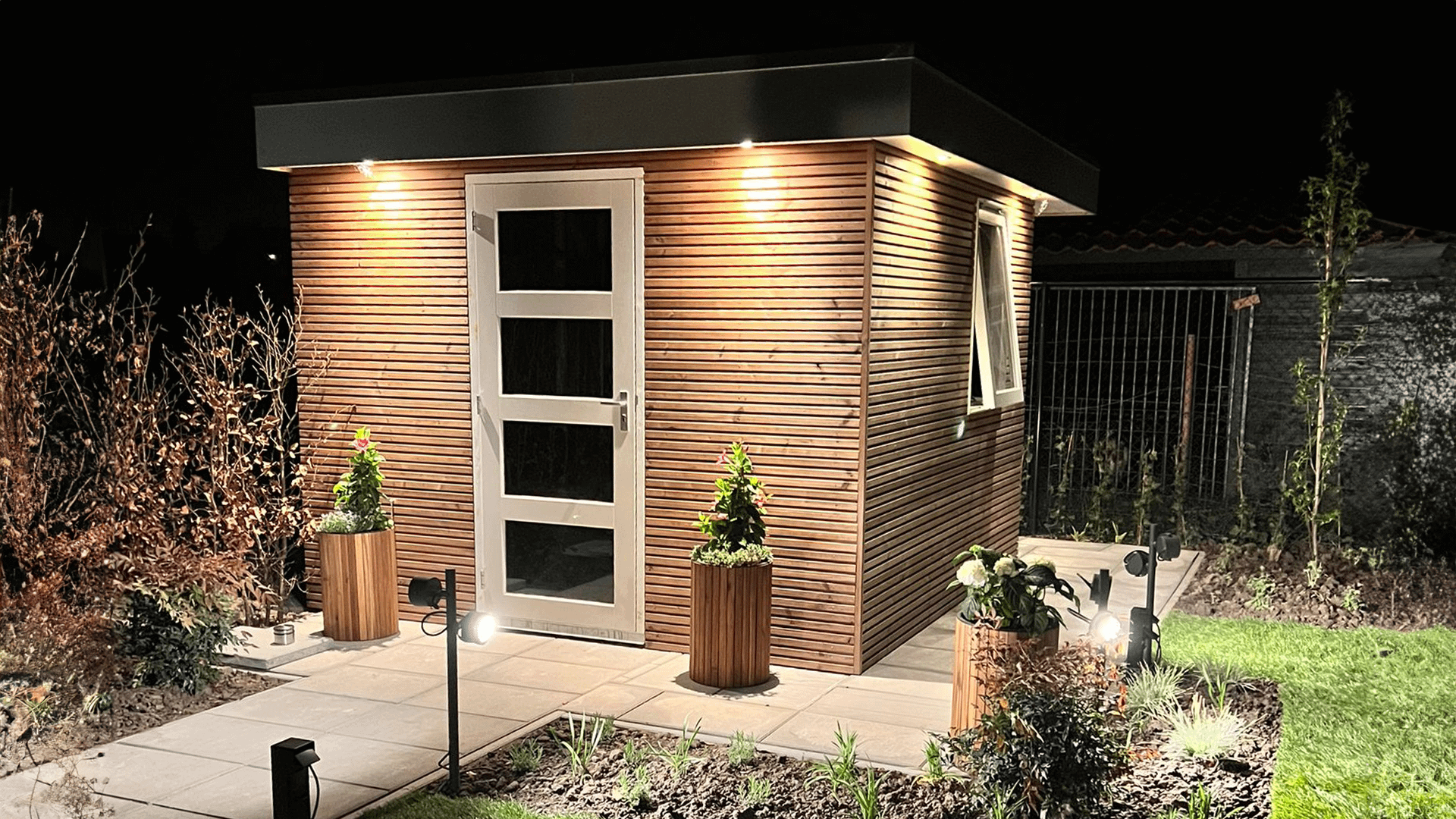 In samenwerking met JVO Lighting verzorgden we de verlichting, de tuinpalen met wcd's en de verlichting in het tuinhuisje. Alles natuurlijk op afstand aan en uit te schakelen. We maken hierbij gebruik van SLV verlichting en Glampere tuinpalen.